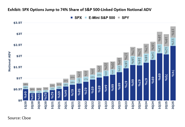 - A Self-Reinforcing Liquidity Flywheel: Taken together, these forces sustain a virtuous cycle of: institutional foundation -> product innovation -> retail adoption -> enhanced liquidity -> broader participation -> stronger institutional commitment. This flywheel has firmly established SPX options as the durable benchmark for S&P 500 options exposure, built on a competitive moat of retail accessibility and deep institutional liquidity. For more, see full report here.