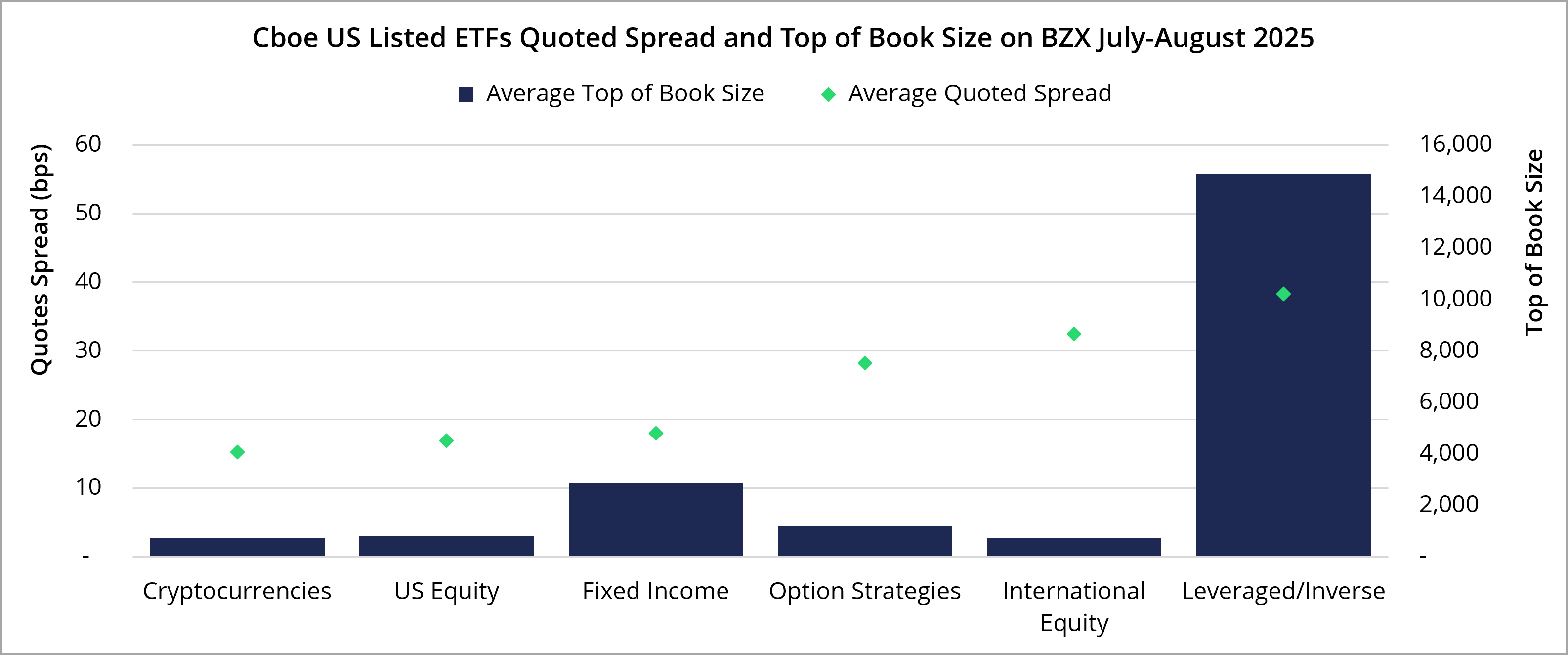 In July and August of 2025, average quoted spreads on Cboe U.S.-listed equity, fixed income, and cryptocurrency ETFs held near 20 basis points, reflecting relatively tight markets for core exposures. Leveraged and inverse ETFs showed the deepest top-of-book liquidity, averaging more than 10,000 shares despite wider spreads and underscoring strong displayed depth even in higher volatility products. Option strategy and international equity ETFs sat in the mid-range, with spreads in the 30-35 basis points zone and top-of-book sizes near 1,000 shares, signaling healthy liquidity across more specialized strategies.