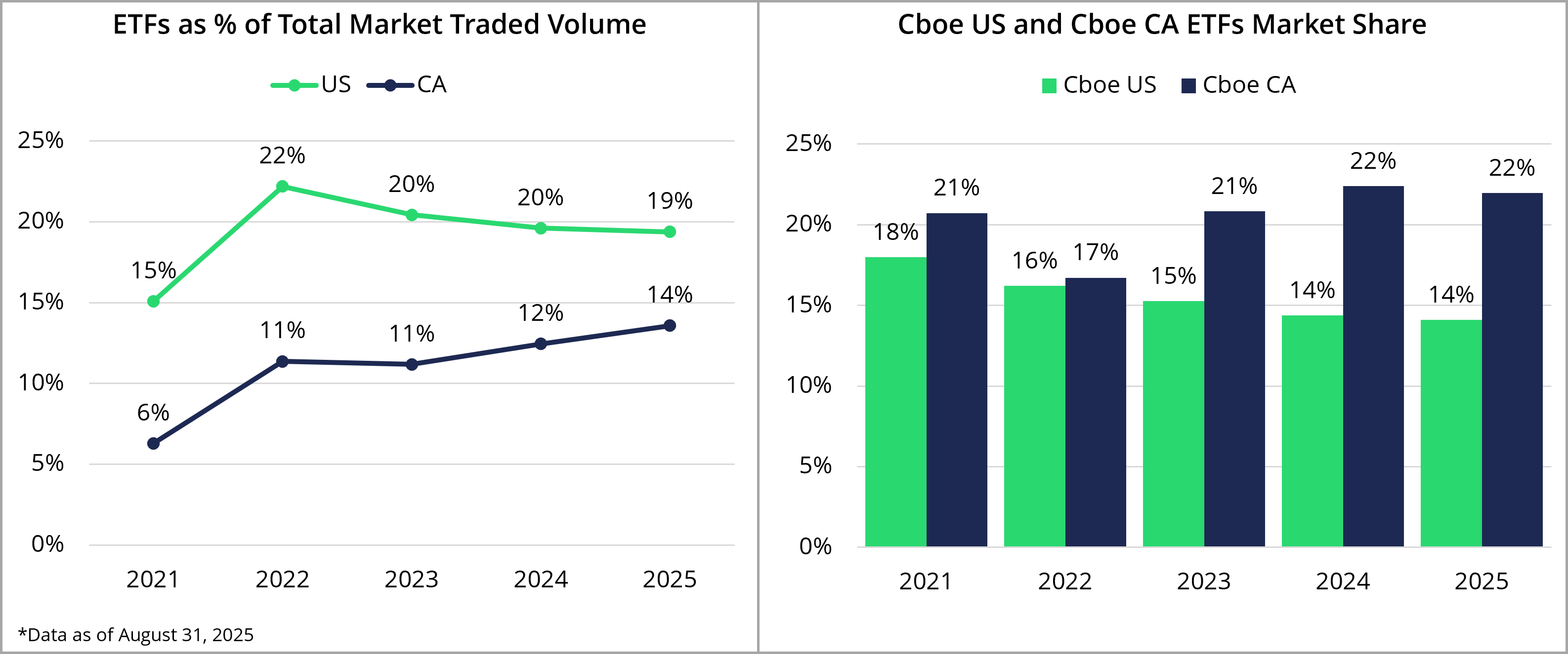 The innovation story extends north of the border as issuers have leaned into new strategies in Canada as well. Notably, Cboe Canada introduced the country’s first ETFs utilizing zero-days-to-expiration (0DTE) options and launched Canada’s first domestic single-stock ETF lineup. Today, Cboe Canada is home to more than 260 ETFs and more than 130 Canadian Depositary Receipts (CDRs), underscoring its growing role as a hub for creative product development.
