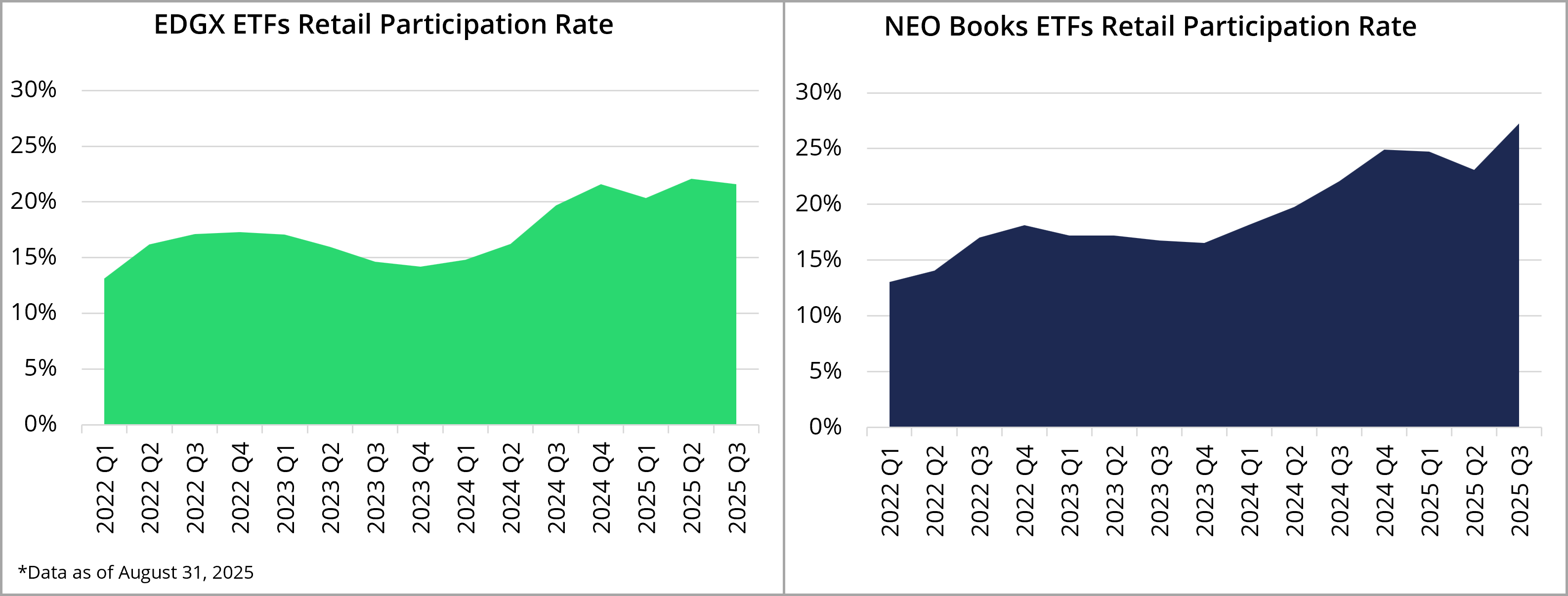 On Cboe EDGX, retail participation in ETFs rose from approximately 15% in the first quarter of 2022 to nearly 22% by the third quarter of 2025. EDGX showed steady growth despite some drawdowns between 2023 and 2024. EDGX remains a preferred venue for retail-driven flow thanks to its Retail Priority program, which provides enhanced queue priority for retail orders and premium rebates that reward retail liquidity provision, making it a key market for investors targeting retail engagement.