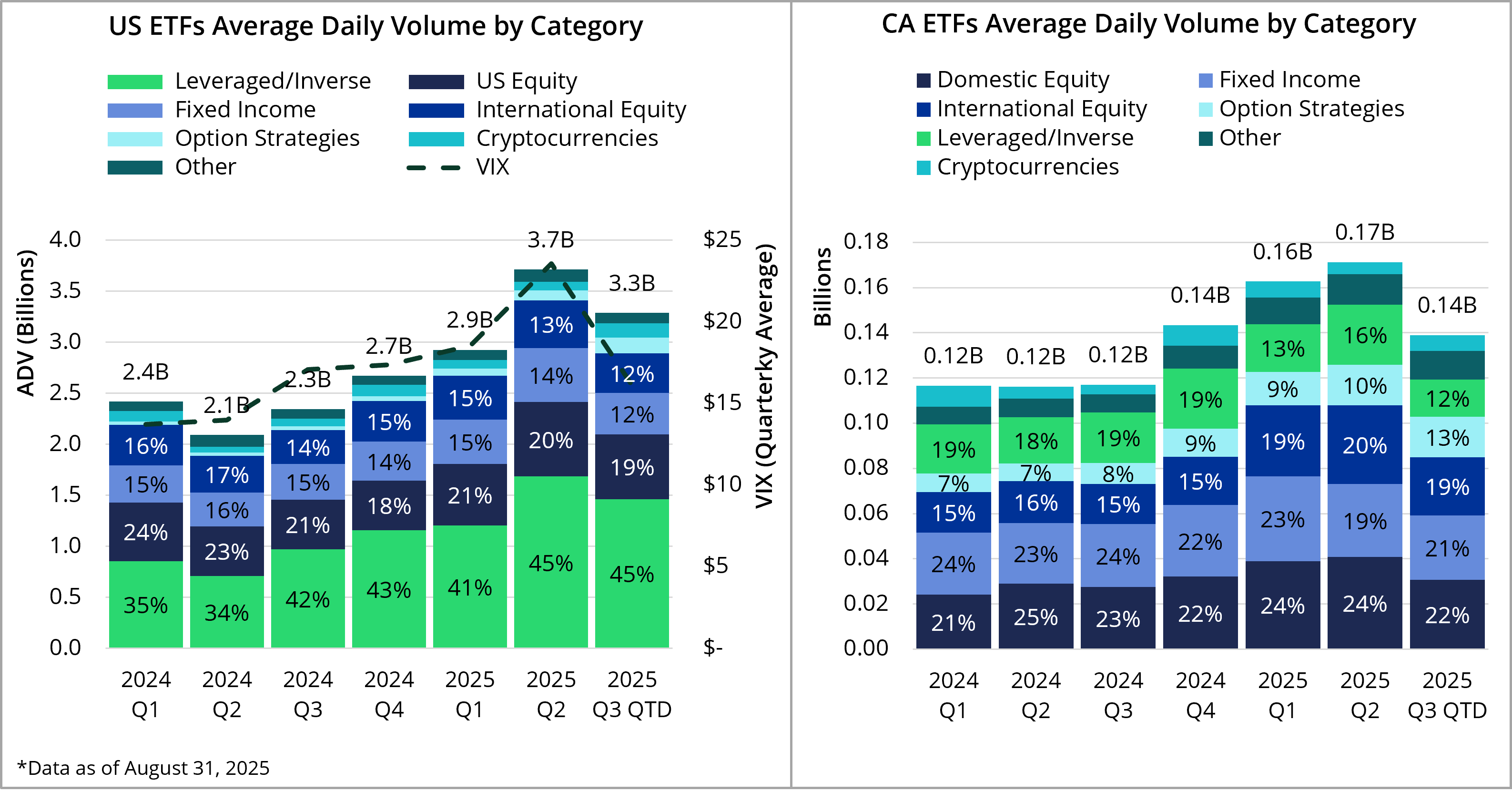 Canadian-listed ETFs ADV mirrors some of the trends seen in the U.S. Option strategy ETFs in the Canadian market posted a 79% year-over-year increase in ADV, closely tracking the U.S. trajectory. International equity ETFs have also gained traction, reflecting a continued growing appetite for global diversification among Canadian investors.