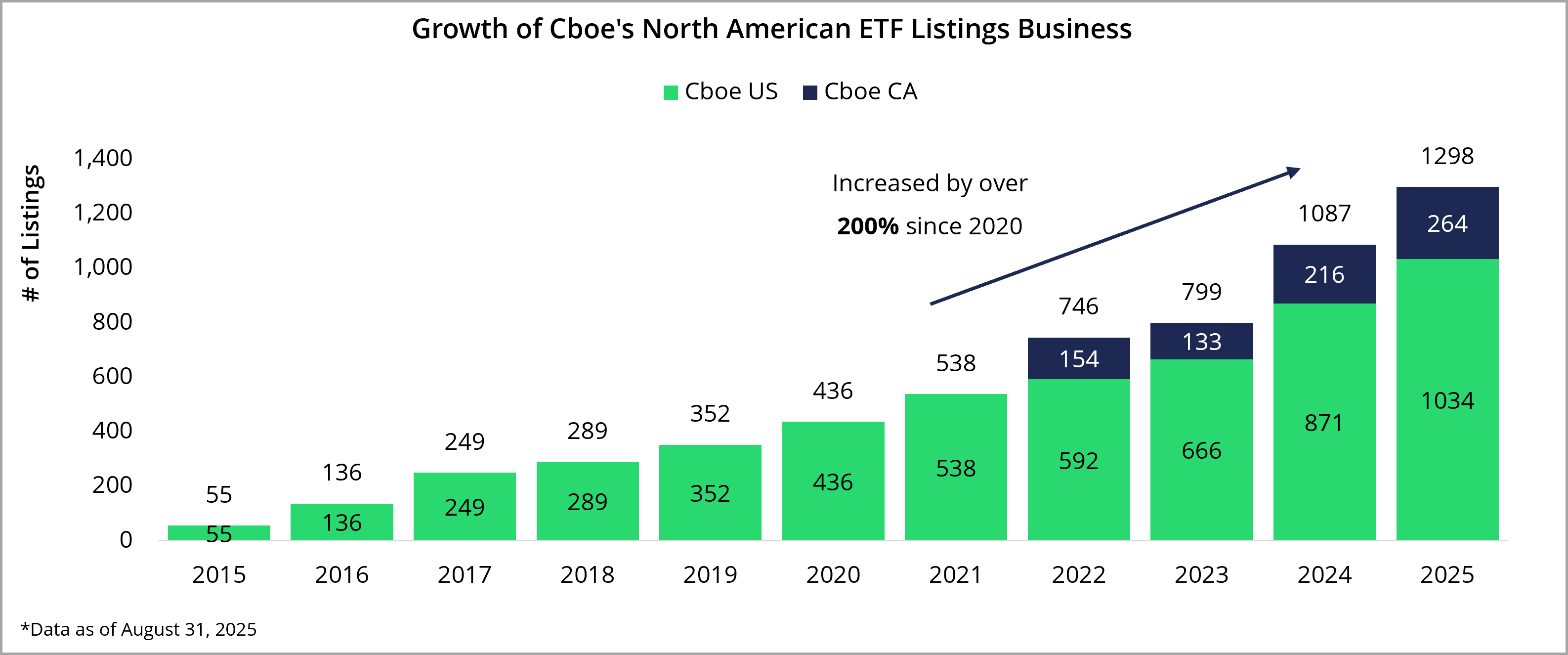 Cboe remains a leader in ETF listings and trading. Cboe is committed to delivering greater access, choices, and efficiency for investors across North America and around the globe, offering strong market share, meaningful retail participation, and a proven track record of innovative listings solutions.
