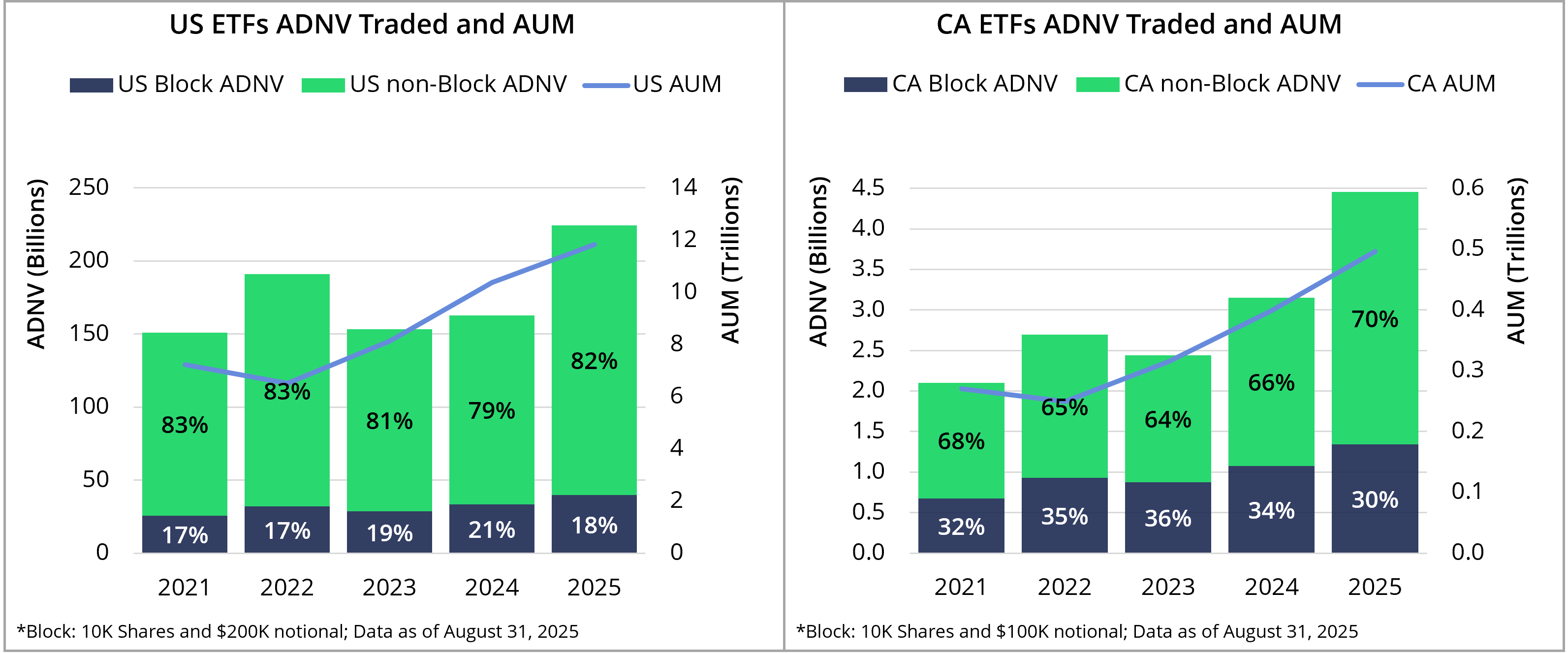 The Canadian ETF market outpaced the U.S. with a 40% year-over-year growth in Average Daily Notional Value (ADNV) traded compared to 32% in the U.S. Notably, in 2025, the proportion of block trades within ADNV has declined across North America, falling by 280 basis points in the U.S. and 400 basis points in Canada since 2024. This trend may signal a transition toward more frequent, smaller trades — likely due to an increase in retail participation. In this analysis, we will look at the growing ETF market in North America and how Cboe continues to provide access to ETF listings and trading for market participants.