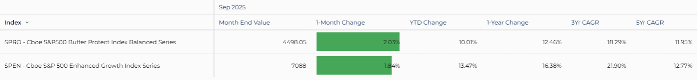 The Cboe S&P 500 Enhanced Growth Index Series (SPEN) and Cboe S&P 500 Buffer Protect Index Balanced SeriesSM (SPROSM) are part of a family of Target Outcome Indices. The Indices are designed to provide target outcome returns linked to the U.S. domestic stock market. The indices measure the performance of a portfolio of hypothetical exchange traded Flexible Exchange® Options ("FLEX® Options") that are based on the S&P 500 Index.