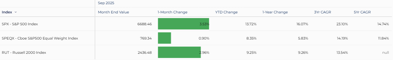 Equity investors enjoyed another month of meaningful gains in September 2025 — the fifth consecutive monthly advance — with the S&P 500® Index (SPX) rising 3.5% to 6,688 and the Russell 2000® Index (RUT) up nearly 3% to 2,436. Both benchmarks ended the month near all-time highs, supported by the long-anticipated Federal Reserve interest rate cut and a relatively stable geopolitical backdrop.