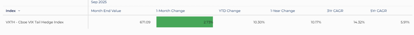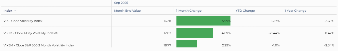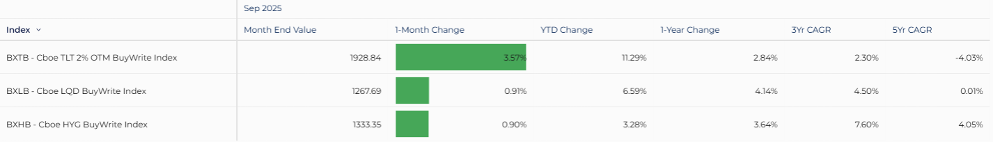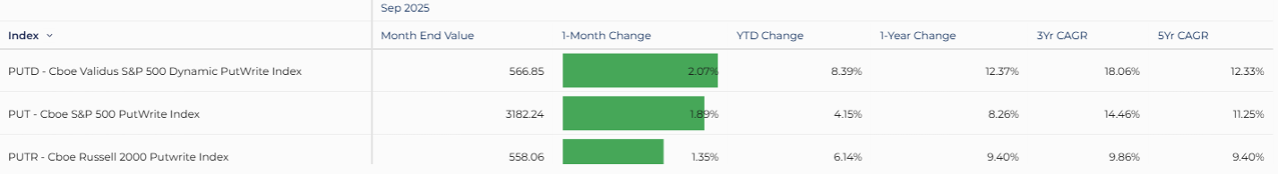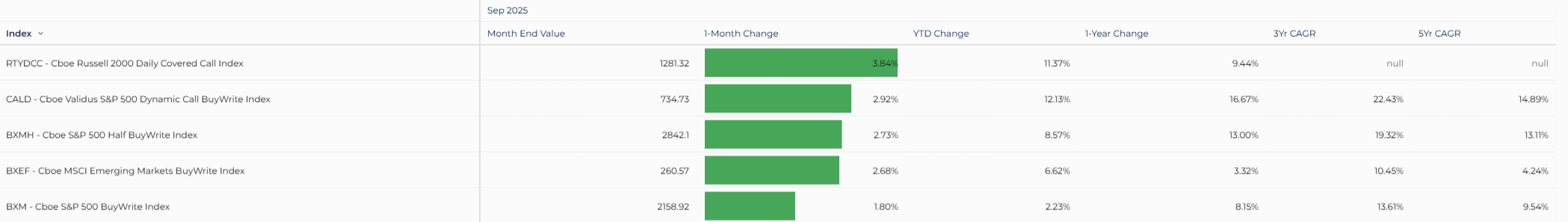 Premium-writing strategies also benefited in September. The Russell Daily Covered Call Index (RTYDCC) increased 3.84%, while the Cboe Validus S&P 500® Dynamic Call BuyWrite℠ Index (CALD) added 2.9%. On the put-writing side, the Cboe Validus S&P 500 Dynamic PutWrite Index (PUTD) led with a 2.07% gain, followed by the Cboe S&P 500 PutWrite Index (PUT) increasing 1.89%.