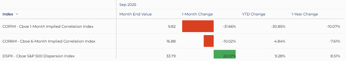 The Cboe S&P 500 Dispersion Index (DSPXSM) measures the expected dispersion in the S&P 500 Index over the next 30 calendar days, as calculated from the prices of S&P 500 Index options and the prices of single stock options of selected S&P 500 Index constituents, using a modified version of the VIX® methodology. The Cboe S&P 500 Implied Correlation Indices, including COR1M and COR6M, are the first widely disseminated market estimates of the average correlation of the stocks that comprise the S&P 500. The Cboe S&P 500 Implied Correlation Indices offers insight into the relative cost of SPX options compared to the price of options on individual stocks that comprise the S&P 500.