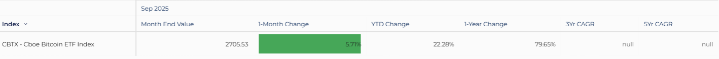 Cryptocurrency markets had great performance where prices rebounded from early-month lows. The Cboe Bitcoin U.S. ETF Index (CBTX) climbed 5.7% to finish near 2,705.